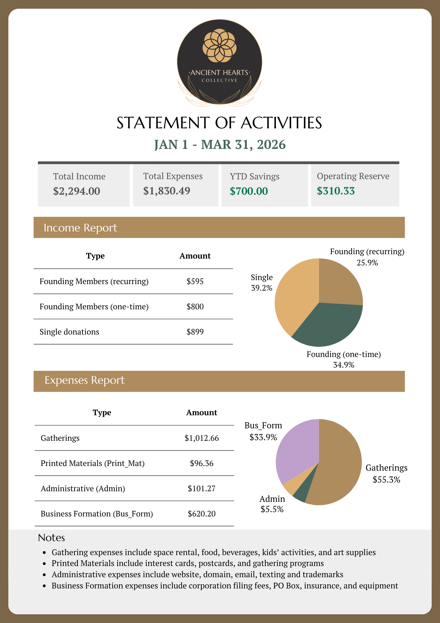 We share our income and expenses each month to keep you informed about our progress toward our community goals.